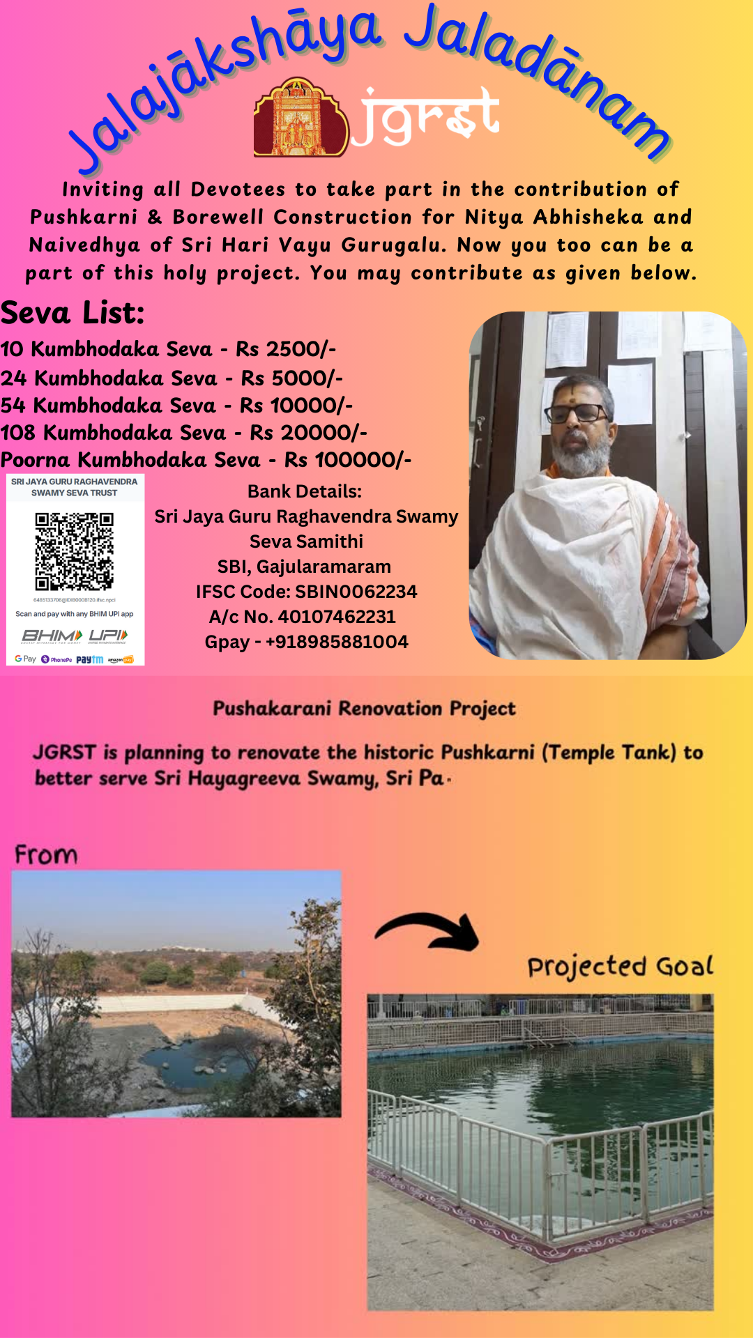 Inviting all Devotees to take part in the contribution of Pushkarni & Borewell Construction for Nitya Abhisheka and Naivedhya of Sri Hari Vayu Gurugalu. Now you too can be a part of this holy project. You may contribute as given below.